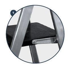 Escalones de aluminio de 80 mm de huella con relieves antideslizantes. Bisagras de PP y perfiles de aluminio de 40x20 y 33x20 mm o 50x20 y 40x20 mm, según referencia. Plataforma de PP con sistema de bloqueo exclusivo. Bielas de acero galvanizado.